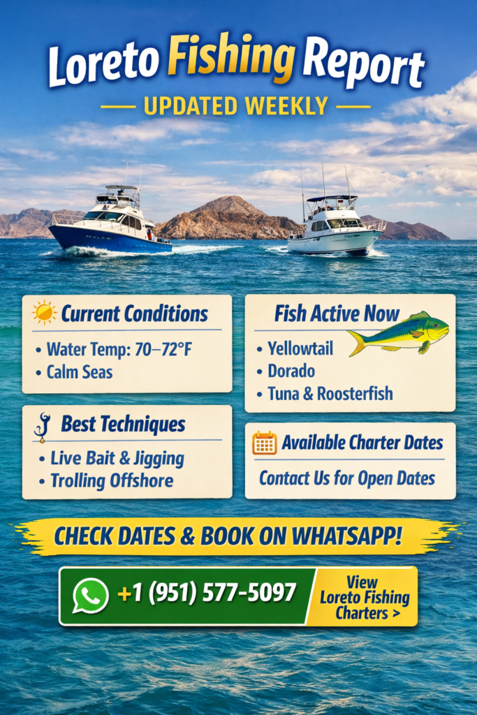 Fishing in Loreto has been excellent this week with strong activity near Coronado Island and surrounding Sea of Cortez waters. Calm seas and stable temperatures are creating ideal fishing conditions.